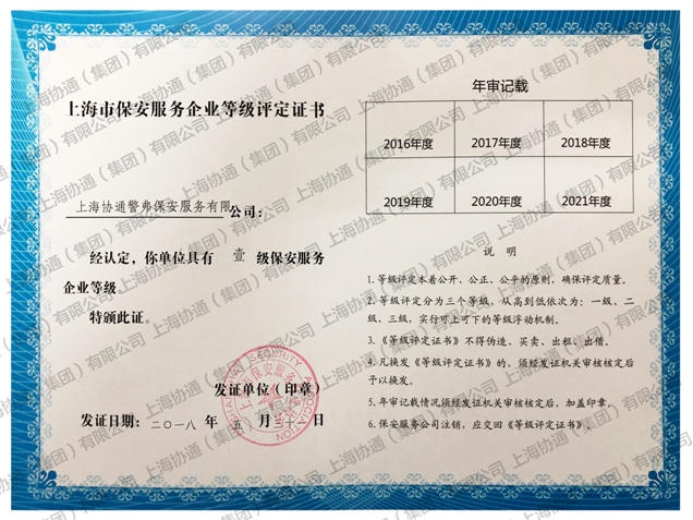協通警弗保安服務有限公司評定為“上海市壹級保安服務企業”